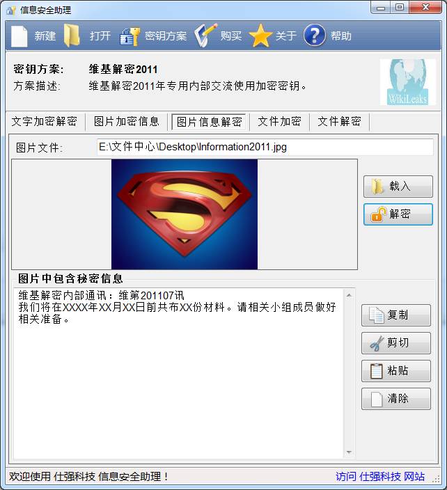 点击“解密”按钮,加密消息内容将显示显示在“图片中包含秘密信息”中