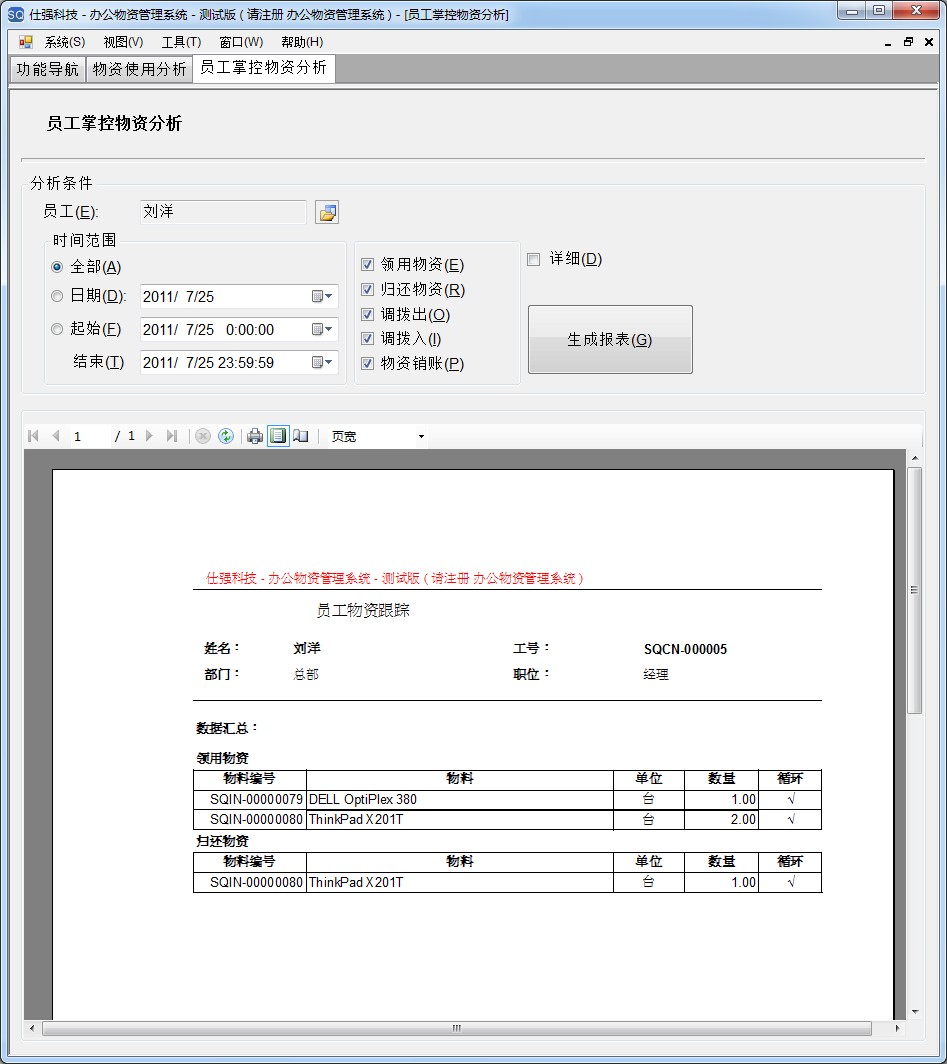 员工物资:在指定日期或时间范围内,员工物资使用情况跟踪。
